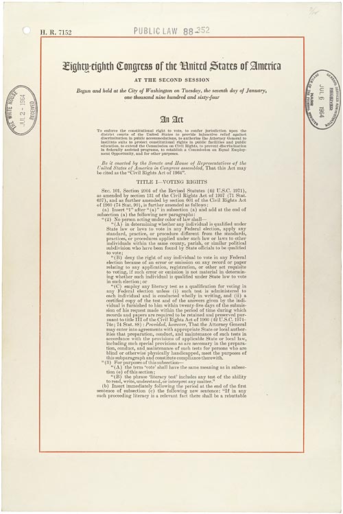 le 2 juillet 1964, le Congrès américain ratifie le Civil Rights Act qui bannit la discrimination reposant sur la race, la couleur, la religion, le sexe, ou l’origine nationale